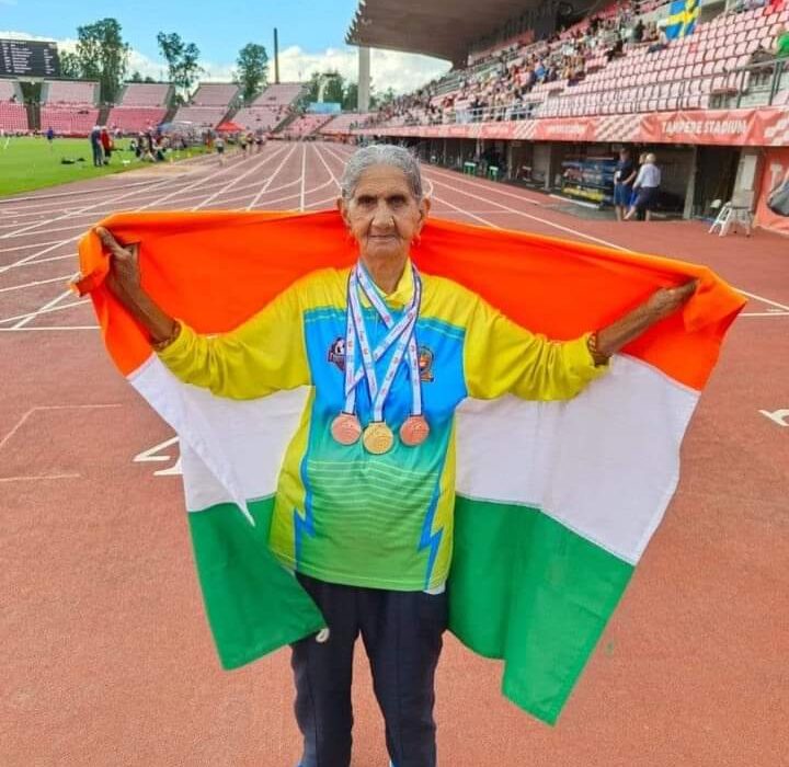 हरियाणा। वर्ल्ड मास्टर्स एथलेटिक्स चैंपियनशिप में गोल्ड और दो ब्रांच मेडल जीतने के बाद दुनिया में हरियाणा की रहने वाली 94 वर्षीय भगवानी देवी ने भारत का डंका बजा दिया है। जब भगवानी देवी पदक जीतकर भारत वापस आई तो दिल्ली एयरपोर्ट पर उनका भव्य स्वागत किया गया और उन्होंने अपनी जीत का जश्न एयरपोर्ट पर डांस करके मनाया वहां पर उनके साथ उनके परिवार के लोग भी मौजूद थे। बता दें कि यह मेडल जीतने के बाद उन्हें क्वीन ऑफ एथलेटिक्स भी कहा जा रहा है और खेल मंत्रालय द्वारा उनकी जीत पर उन्हें बधाई दी गई हैं। भगवानी देवी ने फिनलैंड में आयोजित वर्ल्ड मास्टर्स एथलेटिक्स चैंपियनशिप में 100 मीटर स्प्रिंट इवेंट में केवल 24.74 सेकंड का समय लिया और गोल्ड मेडल अपने नाम किया इसके बाद वह गोला फेंक में भी ब्रांच मेडल जीतकर लाई हैं। भगवानी देवी ने अपनी जीत की खुशी एयरपोर्ट पर डांस करके जाहिर की। उनका कहना है कि वह देश के लिए पदक जीतकर काफी खुश हैं।