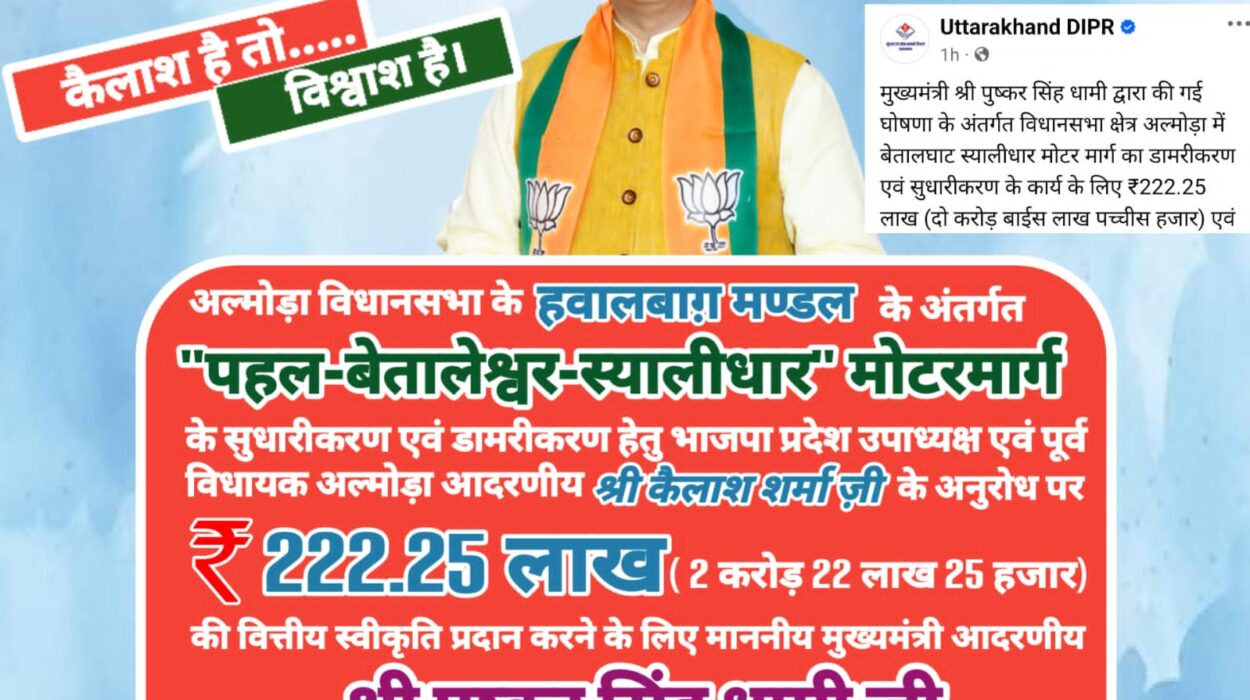 भाजपा प्रदेश उपाध्यक्ष एवं पूर्व विधायक अल्मोड़ा कैलाश शर्मा के अनुरोध को स्वीकार करते हुवे मुख्यमंत्री पुष्कर सिंह धामी ने विधानसभा अल्मोड़ा के अंतर्गत पवित्र बेतालेश्वर मंदिर समेत आसपास के ग्राम सभाओं -पहल, तलाड़, सैनार, बाड़ी, भनार, गरखूंट, विकास भवन, स्यालीधार, देवली, फड़का समेत लगभग से अधिक 10 गावों की बहुप्रतीक्षित मांग पूर्णतः क्षतिग्रस्त हो चुके “पहल बेतालेश्वर स्यालीधार” मोटर मार्ग के सुधारीकरण एवं डामरीकरण हेतु 222.25 लाख (दो करोड़ बाईस लाख पच्चीस हजार) की वित्तीय स्वीकृति प्रदान कर दीं है।