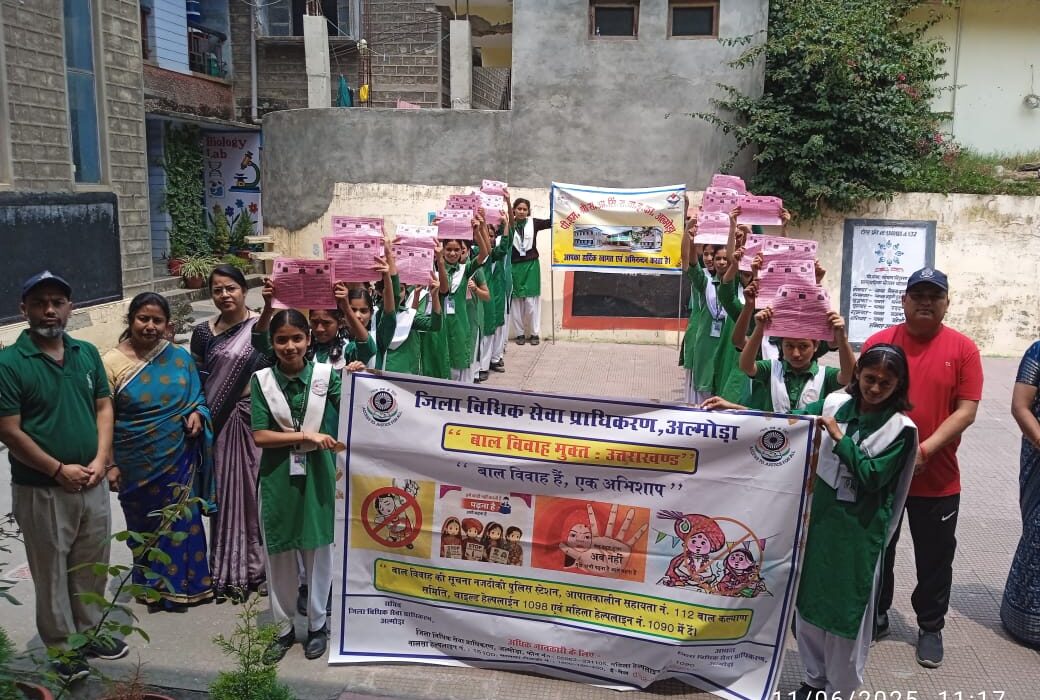 उत्तराखंड राज्य विधिक सेवा प्राधिकरण के दिशा निर्देशानुसार एवं अध्यक्ष जिला विधिक सेवा प्राधिकरण, अल्मोड़ा श्रीकांत पाण्डेय के मार्गदर्शन में व शचि शर्मा सचिव, जिला विधिक सेवा प्राधिकरण, अल्मोड़ा के आदेशानुसार दिनांक 10/06/25 से 12/06/2025 तक “बाल विवाह मुक्त:उत्तराखण्ड” तीन दिवसीय जागरुकता अभियान के अनुक्रम में दिनांक- 11/06/2025 को अधिकार मित्र संदीप सिंह नयाल व पंकज भगत ने राजा आनंद सिंह राजकीय बालिका इंटर कॉलेज अल्मोड़ा में विधिक जागरुकता शिविर व रैली आयोजन किया गया ।शिविर में विद्यार्थियों को बाल विवाह प्रतिषेध अधिनियम 2006, बाल विवाह के दुष्परिणाम, बाल विवाह से मानसिक एवं सामाजिक दुष्परिणाम, चाइल्ड हैल्पलाइन नंबर- 1098, बाल कल्याण समिति या क्षेत्रीय पुलिस हैल्पलाइन 112,नालसा (विधिक सेवा प्राधिकरण के माध्यम से आपदा पीड़ितों को विधिक सेवाएं) योजना, 2010, महिला प्रतिकर योजना-2020, पोक्सो अधिनियम, पीसी एंड पीएनडीटी अधिनियम, एनडीपीएस अधिनियम,”यौन उत्पीड़न/अन्य अपराधों की पीड़ित/उत्तरजीवी महिलाओं के लिए उत्तराखंड मुआवजा योजना, 2020″ नालसा हेल्पलाइन नंबर 15100 आदि के सम्बन्ध में जानकारी दी गई। इस दौरान सुनीता जोशी, पुनीता जोशी, सुजाता शर्मा व रेखा आर्या आदि लोग उपस्थित थे।