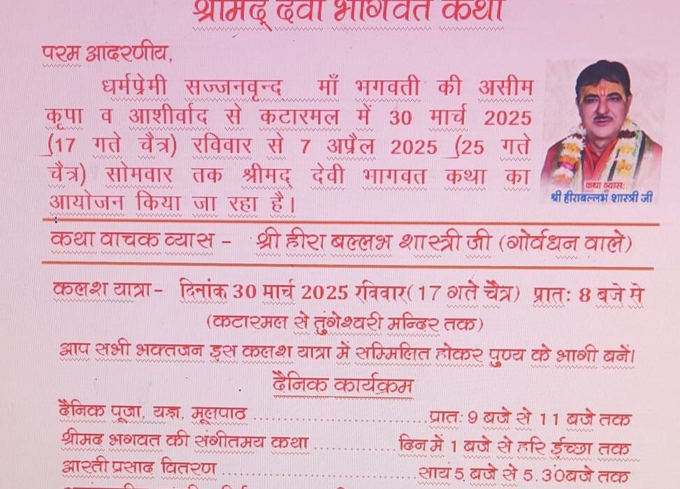 अल्मोड़ा में स्थित सूर्य मंदिर कटारमल में 30 मार्च 2025 यानी कि कल रविवार से 7 अप्रैल 2025 तक श्रीमद् देवी भागवत कथा का आयोजन किया जा रहा है। भागवत कथा में अधिक से अधिक भक्तों से पहुंचने की अपील की गई है। भागवत कथा से पहले दिनांक 30 मार्च को प्रातः 8:00 बजे से कलश यात्रा निकलेगी, यह कलश यात्रा कटारमल से तुंगेश्वरी मंदिर तक होगी और स्थानीय लोगों से कलश यात्रा में सम्मिलित होने की अपील भी की गई है। इसके बाद 9:00 बजे से 11:00 बजे तक दैनिक पूजा पाठ और 1:00 बजे से कथा का आरंभ होगा जिसके बाद 5:00 बजे से आरती और 8:00 बजे से कीर्तन होंगे। इस तरह सोमवार को 7 अप्रैल के दिन हवन तथा भंडारे का आयोजन किया जाएगा।