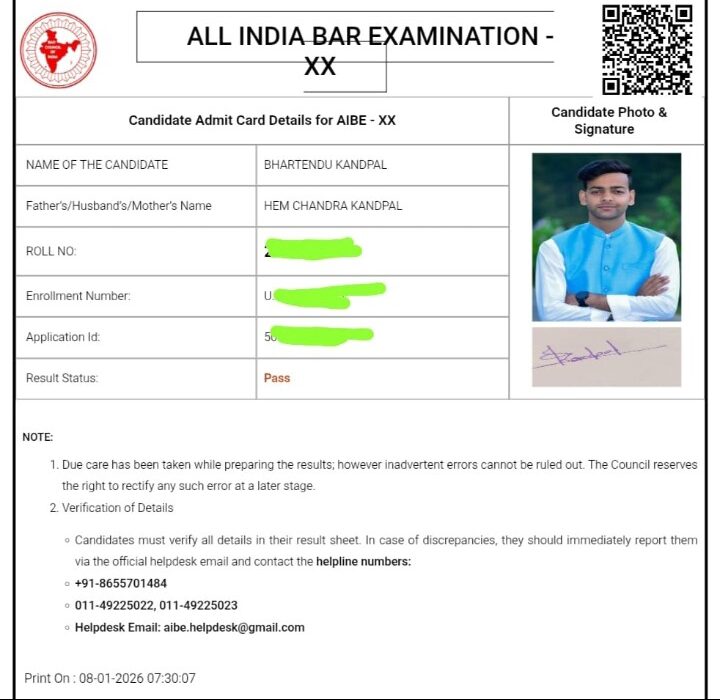 अल्मोड़ा: बार काउंसिल ऑफ इंडिया द्वारा आयोजित 20वीं अखिल भारतीय बार परीक्षा (AIBE-XX) के परिणाम घोषित हो गए हैं।