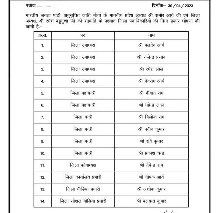 जिसमें उपाध्यक्ष के रूप में बलदेव आर्य, राजेंद्र प्रसाद, रमेश लाल, देवराम आर्य, जिला महामंत्री के रूप में – दीवान राम, महेंद्र लाल, जिला मंत्री के रूप में – त्रिलोक राम, नवीन कुमार, रवि कुमार, प्रकाश चंद्र, कोषाध्यक्ष – देवेंद्र राम कार्यालय मंत्री दीपक आर्य, जिला मीडिया प्रभारी – अशोक कुमार, जिला सोशल- मीडिया प्रभारी बलवंत कुमार, को भारतीय जनता पार्टी अनुसूचित जाति मोर्चा के पदाधिकारियों को उपरोक्त दायित्व दिए जाने पर बहुत-बहुत बधाई दी तथा हर्ष व्यक्त किया है|