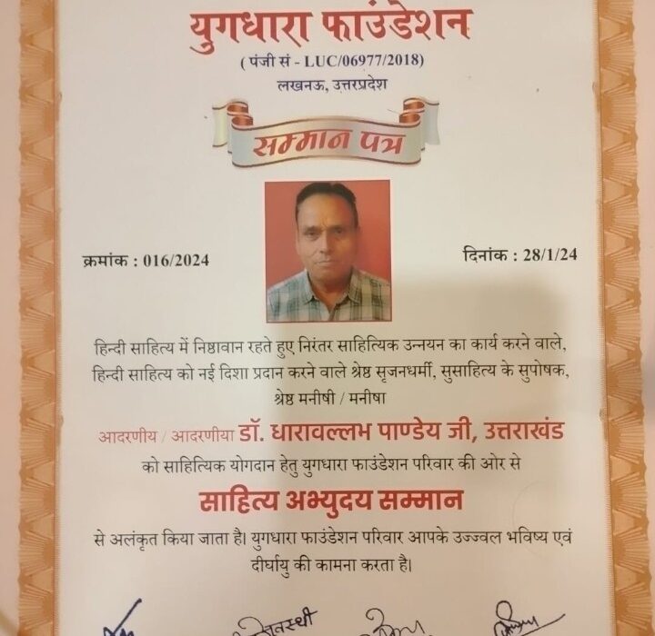 अल्मोड़ा /लखनऊ। युगधारा फाउंडेशन लखनऊ के तत्वावधान में होटल गुलशन प्लाजा, बर्डी, नागपुर, महाराष्ट्र में आयोजित दो दिवसीय अभिव्यक्ति कार्यक्रम के अंतर्गत सम्मान समारोह, पुस्तक लोकार्पण, वैचारिक संगोष्ठी एवं काव्य गोष्ठी में उत्तराखंड, अल्मोड़ा के वरिष्ठ साहित्यकार, कवि, शिक्षाविद, एवं गणितज्ञ डॉ0 धाराबल्लभ पांडेय,’आलोक’ को शाल, श्रीफल, प्रतीक चिह्न, प्रमाण पत्र एवं पुरस्कार राशि प्रदान कर साहित्य अभ्युदय सम्मान से अलंकृत किया गया। यह पुरस्कार उन्हें भीष्म प्रतिज्ञा महाकाव्य पर दिया गया।