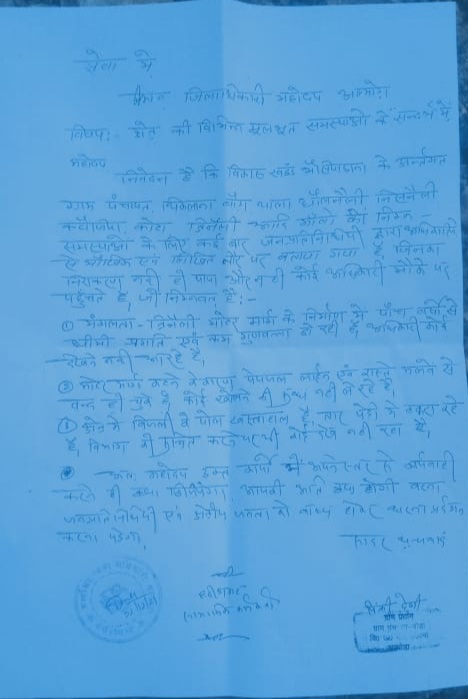 हरीश भट्ट ने कहाँ मगलता त्रिनैली मोटर मार्ग निर्माण में PMGSY विभाग द्वारा भारी अनिमितता की जा रही हैं। मानको के अनुसार कार्य नही किया गया हैं और धीमी गति से कार्य किया जा रहा तथा गुणवत्ता में भी भारी कमी हैं और रोड कार्य मे अनिमितता के कारण पेयजल लाईन खराब ध्वस्त हो गई हैं लोगो को पीने के पानी की दिक्कत का सामना करना पड़ रहा है। लंबे समय से जिला प्रशासन से मांग कर रहे हैं लेकिन आज तक इसका समाधान नहीं हो पाया है ग्रामीण जन में भारी आक्रोश है अगर 1 हफ्ते में समस्या का निराकरण नही होता है तो अनिश्चितकालीन धरना प्रदर्शन किया जाएगा।
