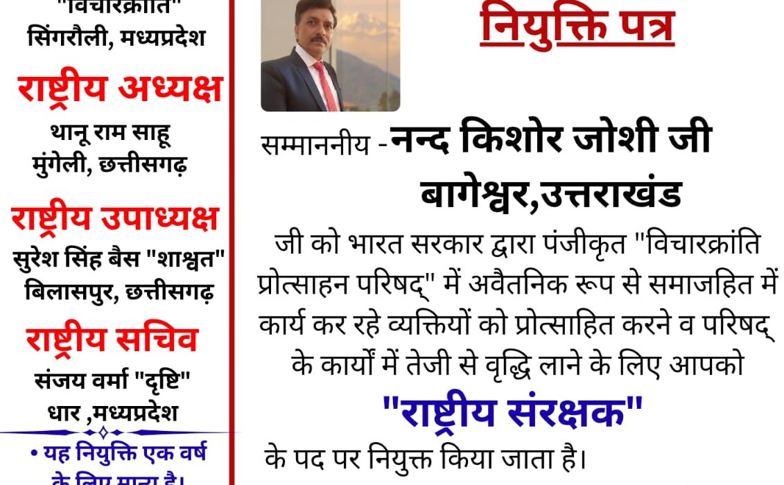 अल्मोड़ा। भारत सरकार द्वारा पंजीकृत विचारक्रांति प्रोत्साहन परिषद् में अवैतनिक रुप से समाजहित में कार्य कर रहे व्यक्तियों को प्रोतसाहित करने व परिषद के कार्यों में तेजी से वृद्धि लाने पर गरुड़ तहसील के पाटली ग्राम निवासी नन्द किशोर जोशी को राष्ट्रीय संरक्षक पद पर नियुक्त किया है।