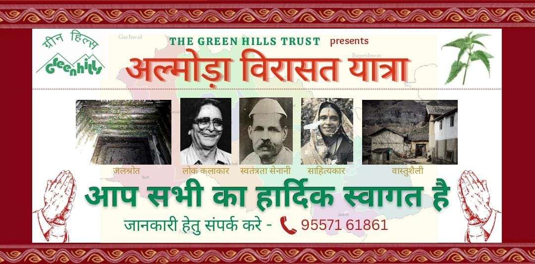 अल्मोड़ा। दिनांक 20-02-2023 सोमवार को ग्रीन हिल्स ट्रस्ट द्वारा सिद्ध नौला आर्मी गेट पलटन बाजार अल्मोड़ा से प्रातः 11:00 विरासत यात्रा का शुभारंभ किया जा रहा है।