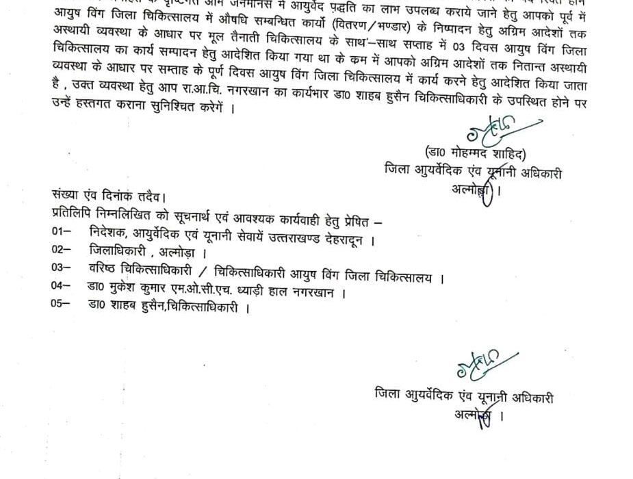 इस समस्या के समाधान के लिए कार्यालय जिला आयुर्वेदिक एवं यूनानी अधिकारी, अल्मोड़ा द्वारा आदेश जारी करते हुए फार्मेसी अधिकारी मदन प्रकाश को आयुष विंग जिला चिकित्सालय में सेवाएं देने के लिए तैनात किया गया है। जारी आदेश के अनुसार मदन प्रकाश, जो वर्तमान में राजकीय आयुर्वेदिक चिकित्सालय नगरखान में तैनात हैं, अब सोमवार से शनिवार तक सप्ताह के छह दिन जिला चिकित्सालय के आयुष विंग में अपनी सेवाएं देंगे। यह व्यवस्था अग्रिम आदेशों तक प्रभावी रहेगी। उल्लेखनीय है कि इससे पहले उन्हें सप्ताह में केवल तीन दिन के लिए यहां सेवाएं देने के निर्देश दिए गए थे, लेकिन मरीजों की सुविधा को देखते हुए अब उनकी सेवाएं छह दिन कर दी गई हैं।गौरतलब है कि इस गंभीर समस्या को लेकर सामाजिक कार्यकर्ता संजय पाण्डे लगातार प्रयासरत रहे। उन्होंने कई बार जिलाधिकारी से इस विषय पर वार्ता की, साथ ही देहरादून स्थित विभागीय उच्चाधिकारियों से भी संपर्क बनाए रखा। इसके अतिरिक्त सूचना के अधिकार (आरटीआई) के माध्यम से भी इस मुद्दे को प्रमुखता से उठाकर प्रशासन का ध्यान आकर्षित किया।