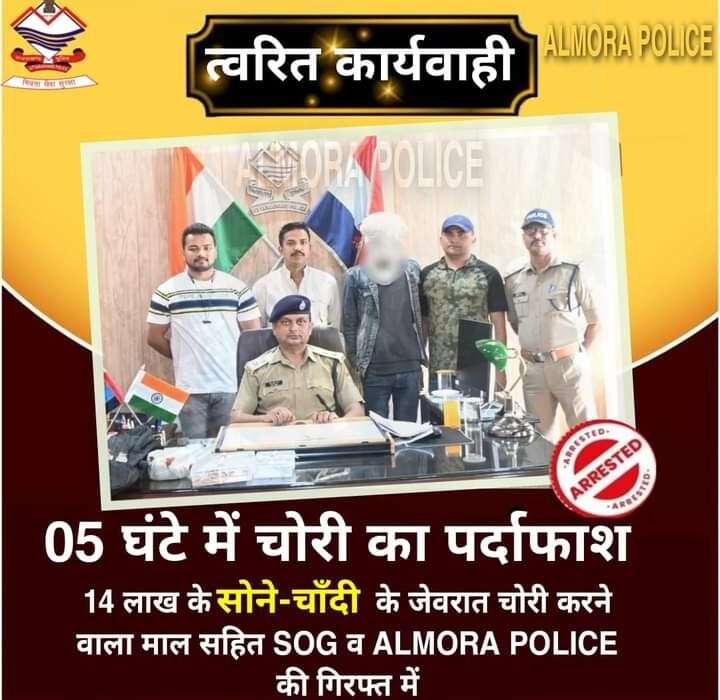 अल्मोड़ा। दिनांक 21/06/2022 की सांय को राजेश कुमार नन्दा पुत्र राजेन्द्र प्रसाद निवासी- ग्राम शैल एनटीडी थाना व जिला अल्मोड़ा द्वारा कोतवाली अल्मोड़ा में एफ0आई0आर0 दर्ज करायी कि वादी के घर से अज्ञात व्यक्ति द्वारा ताला तोड़कर 14 लाख के सोने-चाँदी के आभूषण व अन्य सामान चोरी कर लिया गया है। प्रदीप कुमार राय एसएसपी अल्मोड़ा द्वारा मामले का तत्काल संज्ञान लेते चोरी का शीघ्र खुलासा व अभियुक्त की गिरफ्तारी हेतु पुलिस उपाधीक्षक आँपरेशन ओशीन जोशी व प्रभारी निरीक्षक कोतवाली अल्मोड़ा राजेश यादव को तत्काल टीम गठित करने हेतु निर्देशित किया गया।