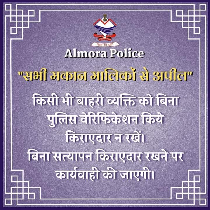 अल्मोड़ा। आमजन की सुरक्षा के लिए अल्मोड़ा पुलिस ने आज अपने सोशल मीडिया अकाउंट के माध्यम से एक नई चेतावनी और अपील जारी की है यह अपील खास कर उन मकान मालिकों के लिए है जो बगैर किसी सत्यापन किए अपने कमरे किराए पर अपरिचित व्यक्तियों को दे देते हैंपुलिस ने जारी इस अपील में अल्मोड़ा के समस्त मकान मालिकों से बगैर पुलिस सत्यापन के किसी को भी कमरा अथवा दुकान किराए पर ना देने की हिदायत दी है वहीं पुलिस ने ऐसा करने वालों पर कार्यवाही करने की भी चेतावनी दी है