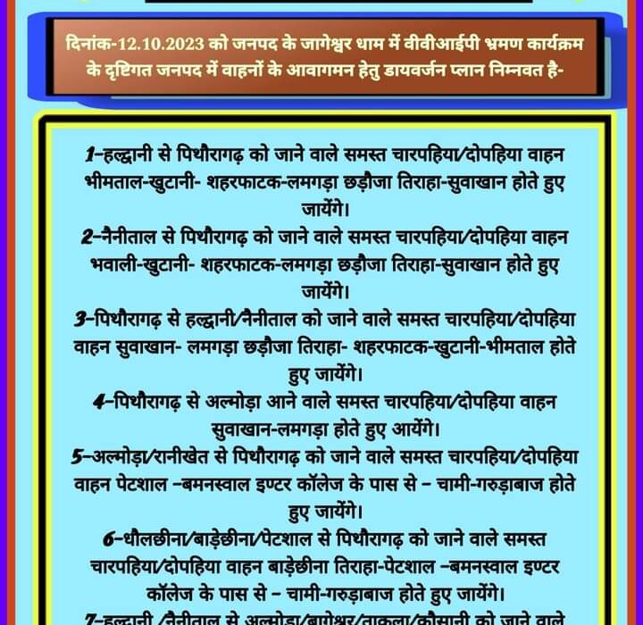 1- हल्द्वानी से पिथौरागढ़ को जाने वाले समस्त चारपहिया/दोपहिया वाहन भीमताल-खुटानी- शहरफाटक-लमगड़ा छड़ौजा तिराहा-सुवाखान होते हुए जायेंगे।