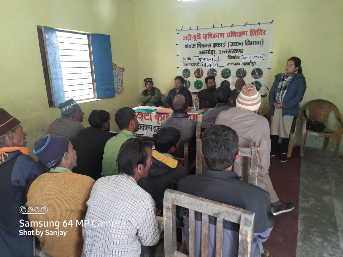आज यानी कि 22 दिसंबर 2021 को बुधवार के दिन विकासखंड धौलादेवी के ग्राम पंचायत चौसाला में ग्राम प्रधान चौसाला सौरभ गुरुरानी की अध्यक्षता में भेसज विकाश इकाई अल्मोड़ा व उद्यान विभाग द्वारा एक दिवसीय जड़ी-बूटी कृषि करण प्रशिक्षण शिविर का आयोजन किया गया था। जिसमें उद्यान विभाग द्वारा किसानों को जड़ी बूटी संबंधी प्रशिक्षण दिया गया।