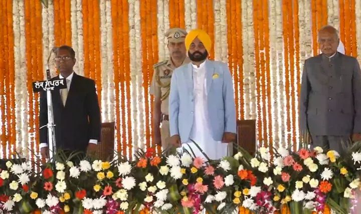 आम आदमी पार्टी की प्रचंड जीत के बाद भगवंत मान ने आज नवांशहर के खटकड़ कलां में मुख्यमंत्री पद की शपथ ली| शपथ समारोह स्थल पर राज्यपाल बनवारीलाल पुरोहित के पहुंचने के बाद शपथ ग्रहण समारोह की शुरुआत हुई| भागवंत मान ने मुख्यमंत्री पद और गोपनीयता की शपथ पंजाबी में ली उन्होंने अकेले शपथ ली| समारोह की शुरुआत राष्ट्रीय गान से हुई और समारोह का समापन भगवंत मान की शपथ लेने के बाद हुआ| इस शपथ ग्रहण समारोह में दिल्ली के मुख्यमंत्री अरविंद केजरीवाल, दिल्ली के उपमुख्यमंत्री व पंजाब आप के प्रभारी मनीष सिसोदिया भी पीली पगड़ी में समारोह में मौजूद रहे| राज्यपाल के पहुंचते ही शपथ ग्रहण समारोह शुरू हुआ इसके बाद भगवंत मान ने शपथ ली और इसके बाद मुख्यमंत्री भगवंत मान ने समारोह में पहुंचे लोगों को संबोधित किया उन्होंने कहा कि जिन्होंने आप को वोट नहीं दिया उनकी भी सरकार है| किसी से कोई भेदभाव नहीं होगा शहीद-ए-आजम को हमेशा फिक्र थी कि आजादी के बाद देश कैसे चलेगा| हम इसी देश में रहकर अपने देश को ठीक करेंगे दूसरे देशों में जाकर धक्के नहीं खाएंगे|