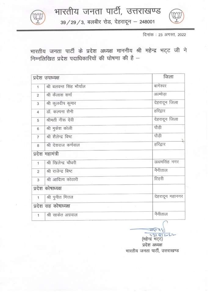 भारतीय जनता पार्टी के नवनियुक्त प्रदेश अध्यक्ष महेंद्र भट्ट ने अपनी टीम की घोषणा कर दी है भारतीय जनता पार्टी के फेसबुक पेज में सभी प्रदेश पदाधिकारियों की जानकारी साझा की गई है जिसमें अल्मोड़ा से पूर्व विधायक कैलाश शर्मा को लगातार तीसरी बार प्रदेश उपाध्यक्ष और शशांक रावत को भारतीय जनता युवा मोर्चा का प्रदेश अध्यक्ष बनाया गया है बागेश्वर कपकोट के पूर्व विधायक बलवंत सिंह पूर्व प्रदेश महामंत्री कुलदीप कुमार राज्यसभा सांसद डॉ कल्पना सैनी को प्रदेश उपाध्यक्ष की जिम्मेदारी सौंपी गई है इसके अलावा आशा नौटियाल को महिला मोर्चा जोगेंद्र पुंडीर को किसान मोर्चा का प्रदेश अध्यक्ष बनाया गया है|
