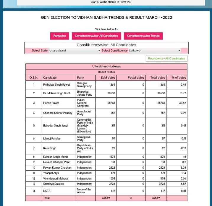 बड़ी खबर:- लाल कुआं विधानसभा सीट से 14000 वोटों से हारे पूर्व मुख्यमंत्री हरीश रावत