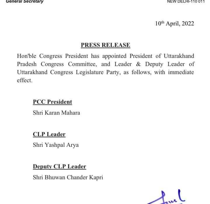 वहीं दूसरी ओर अल्मोड़ा के रानीखेत से पूर्व विधायक और पूर्व उप नेता प्रतिपक्ष करण मेहरा को प्रदेश अध्यक्ष की जिम्मेदारी दी गई है, वर्ष 2017 के विधानसभा चुनाव में करण मेहरा ने तत्कालीन भाजपा प्रदेश अध्यक्ष और मौजूदा केंद्रीय मंत्री अजय भट्ट को करारी शिकस्त दी थी हालांकि 2022 के विधानसभा चुनाव में भाजपा के प्रत्याशी प्रमोद नैनवाल ने उन्हें अच्छे खासे अंतर से हराया, करण म्हारा कांग्रेस के तेजतर्रार नेता माने जाते हैं