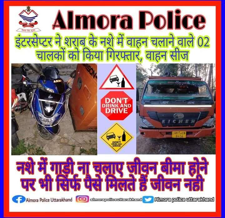 श्री प्रदीप कुमार राय एसएसपी अल्मोड़ा द्वारा जनपद में दुर्घटनाओं में कमी लाने के उद्देश्य से नशे में वाहन चलाने व खतरनाक तरीके से वाहन चलाने वालों के विरुद्ध कड़ी कार्यवाही करने के निर्देश पर चैकिग अभियान के दौरान दिनांक 27/06/2022 को इंटरसेप्टर प्रभारी श्री जीवन सामंत मय हमराह का0 सुनील कुमार, का0 ललित द्वारा लोधिया के पास चैकिंग के दौरान वाहन संख्या UK04CB 0414 डम्पर के चालक इंद्र सिंह पुत्र श्री किशन सिंह निवासी ग्राम सुकनिया, मटालिया , धारी जिला नैनीताल को शराब के नशे में वाहन चलाते पाये जाने पर मोटर वाहन अधिनियम के अंतर्गत *गिरफ्तार कर, वाहन को मौके पर वाहन सीज किया गया।