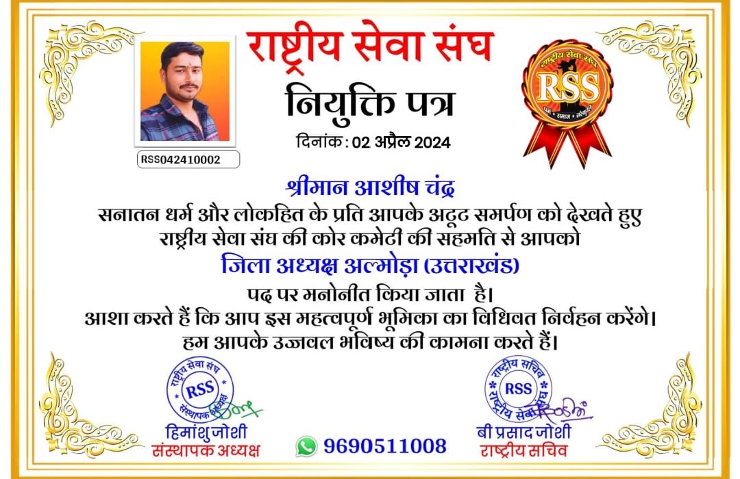 अल्मोड़ा। राष्ट्रीय सेवा संघ द्वारा आज पूरे उत्तराखंड प्रदेश की कार्यकारिणी में विस्तार किया गया। जिसमें सभी पदाधिकारी अपने कार्यक्षेत्र से धर्म, समाज और संस्कृति की रक्षा हेतु वचनबद्ध हैं। इसी घोषणा में अल्मोड़ा जनपद से आशीष भट्ट को जिलाध्यक्ष तथा कन्हैया बिष्ट को जिला महामंत्री मनोनीत किया गया।