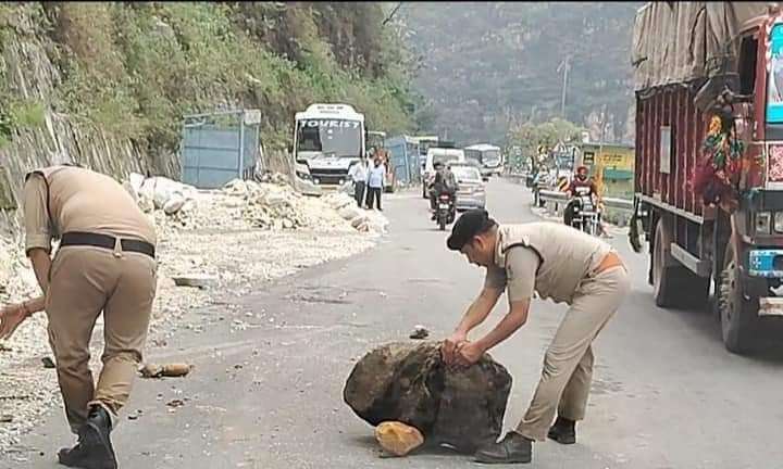 सोशल मीडिया के दौर में अक्सर कोई न कोई फोटो विडियो वायरल होते रहता है। कुछ वीडियो ऐसे भी होते हैं, जो अच्छाई पर हमारा भरोसा और मजबूर कर देते हैं। चमोली में ऐसा ही वीडियो सामने आया है, यहाँ लोगो को परेशानी से बचाने के लिए पुलिसकर्मी खुद सड़क से पत्थर हटाने लगे। हुआ यूं कि यातायात निरीक्षक प्रवीण आलोक इंटरसेप्टर में चमोली – क्षेत्रपाल के बीच ड्यूटी पर मौजूद थे। तभी अचानक पहाड़ी से एक बड़ा सा पत्थर सड़क पर आ गिरा, पत्थर वाहन चालकों के लिए मुसीबत बन रहा था। मौके पर मौजूद यातायात निरीक्षक प्रवीण आलोक व कां0 नीरज भंडारी से ये सब देखा नही गया व जेसीबी का इंतजार किये बिना स्थानीय व्यक्तियों की सहायता से पत्थर को सड़क से किनारे कर दिया।