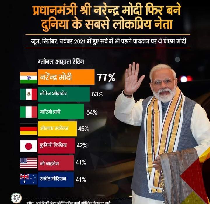 नई दिल्ली| एक बार फिर पीएम नरेंद्र मोदी दुनिया के सबसे लोकप्रिय नेता चुने गए है| मॉर्निंग कंसल्ट की ओर से जारी ग्लोबल लीडर अप्रूवल रेटिंग में पीएम मोदी 77 फ़ीसदी अप्रूवल के साथ टॉप पर हैं| पीएम मोदी को दुनिया भर में वयस्कों के बीच सबसे ज्यादा रेटिंग मिली है| इस खुशी पर भाजपा ने ट्वीट करके लिखा है कि वैश्विक नेताओं की तुलना में सबसे अधिक लोकप्रिय है, प्रधानमंत्री नरेंद्र मोदी 77 फ़ीसदी| ग्लोबल अप्रूवल रेटिंग के साथ पहले पायदान पर पीएम मोदी के नेतृत्व में देश आत्मनिर्भर भारत बनने की ओर अग्रसर है| अमेरिका में मौजूद ग्लोबल लीडर अप्रूवल ट्रैकर मॉर्निंग कंसल्ट वैश्विक नेताओं की अप्रूवल रेटिंग जारी की है इस बार पीएम नरेंद्र मोदी की रेटिंग सबसे अधिक है| और वह 77 फ़ीसदी अप्रूवल रेटिंग के साथ दुनिया के सबसे लोकप्रिय नेता बने हुए हैं| पीएम मोदी के अप्रूवल रेटिंग 13 देशों के नेताओं में सबसे अधिक है| इस डेटा में यह दिखाया गया है कि प्रधानमंत्री की लोकप्रियता कितनी अधिक है|