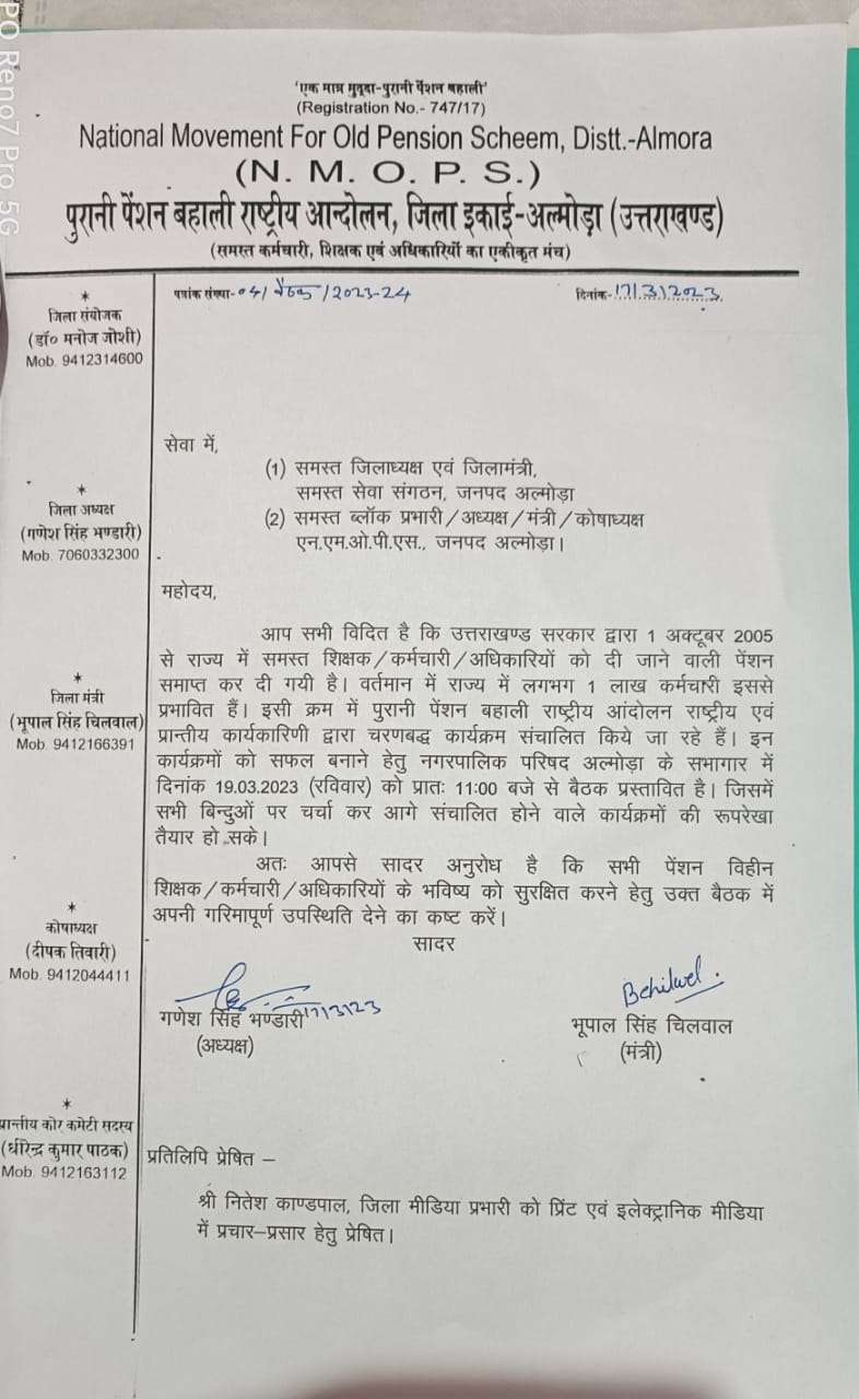 जिलाध्यक्ष गणेश भण्डारी ने बताया कि राष्ट्रीय एवं प्रांतीय नेतृत्व ने चरणबद्ध कार्यक्रम तय किये है। जिसमें 16 अप्रैल को जिला मुख्यालय में रैली बहुत बड़ी रैली होगी। जून मे राष्ट्रीय कार्यकारिणी द्वारा पुरानी पेंशन बहाली के रथयात्रा निकाली जा रही है। 1 अगस्त से 9 अगस्त तक सांसदो के घर पर घंटी बजाओ कार्यक्रम है| उसके बाद जब राज्य मे पेंशन बंद की गयी थी 1 अक्टूबर को देश के सभी शिक्षक/कर्मचारी दिल्ली मे धरना देंगे एवं vote for OPS की मुहिम को आगे बढाते हुए पुरानी पेंशन के लिए आगामी लोकसभा चुनाव मे वोट करेंगे| इन कार्यक्रमों की रूपरेखा तैयार करने हेतु 19 मार्च रविवार को प्रातः 11 बजे से नगरपालिका अल्मोड़ा के सभागार मे सभी संगठनों के पदाधिकारियों सहित ब्लॉक कार्यकारिणीयों की सामुहिक बैठक रखी गयी है| जिससे आगे की रणनीति तैयार की जा सके।