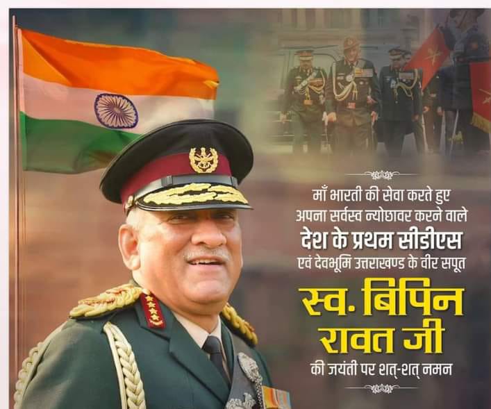 देश के पहले सीडीएस जनरल स्वर्गीय बिपिन रावत की जयंती पर आज दिनांक 16 मार्च 2022 को बुधवार के दिन पूरे उत्तराखंड वासियों ने अपने राज्य समेत पूरे देश के हीरो स्वर्गीय बिपिन रावत को याद किया तथा राज्य में जनप्रतिनिधियों और लोगों ने पोस्ट के माध्यम से उन्हें याद किया। तथा पूर्व केंद्रीय मंत्री एवं पूर्व मुख्यमंत्री रमेश पोखरियाल निशंक ने भी उन्हें श्रद्धांजलि देते हुए सोशल मीडिया पर पोस्ट किया और लिखा वीर थे, रणधीर थे दूर्जेेय शूरवीर थे। तथा उनके अलावा पूर्व मुख्यमंत्री त्रिवेंद्र सिंह रावत ने भी उन्हें श्रद्धांजलि दी और कहा कि अपने देश के वीरों को भूलने वाले नष्ट हो जाते हैं और कहां की जनरल रावत जनता के जनरल थे। व इस अवसर पर ऋषिकेश के नगर निगम महापौर अनीता मंगाई के नेतृत्व में आज सीडीएस जनरल स्व. बिपिन सिंह रावत की जयंती पर भाजपा कार्यकर्ताओं ने कुष्ठ रोगियों को फल भी वितरित किए।