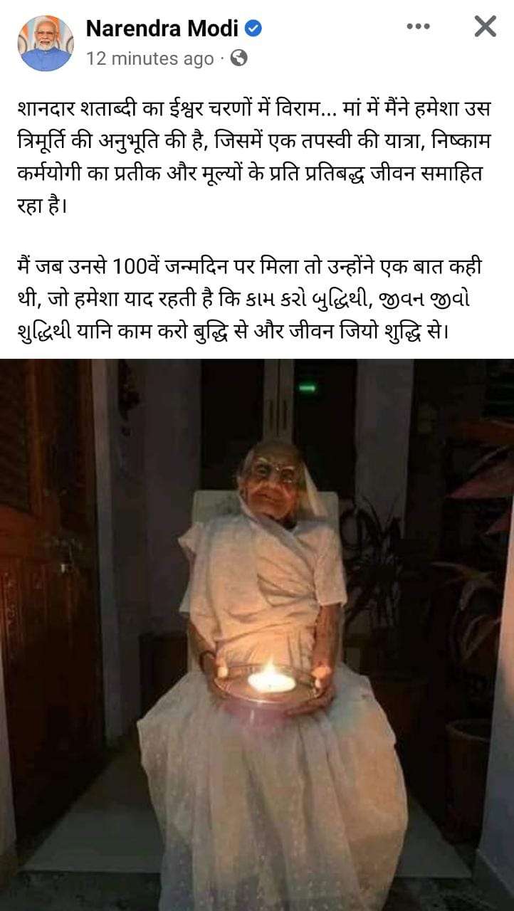 मां के निधन पर पीएम मोदी ने दु:ख जताते हुए लिखा, “शानदार शताब्दी का ईश्वर चरणों में विराम… मां में मैंने हमेशा उस त्रिमूर्ति की अनुभूति की है, जिसमें एक तपस्वी की यात्रा, निष्काम कर्मयोगी का प्रतीक और मूल्यों के प्रति प्रतिबद्ध जीवन समाहित रहा है|”