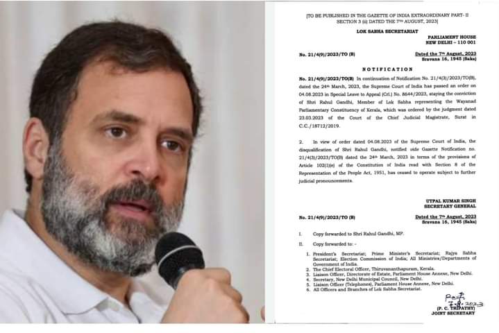 इसके बाद से ही इस बात की अटकलें लगाई जा रही थीं कि राहुल गांधी की सदस्यता बहाल हो सकती है, जिसे आज लोकसभा सचिवालय ने बहाल कर दिया| राहुल गांधी की संसद सदस्यता बहाल होने से कांग्रेस समेत पूरे I.N.D.I.A गठबंधन में जोश देखा जा रहा है|