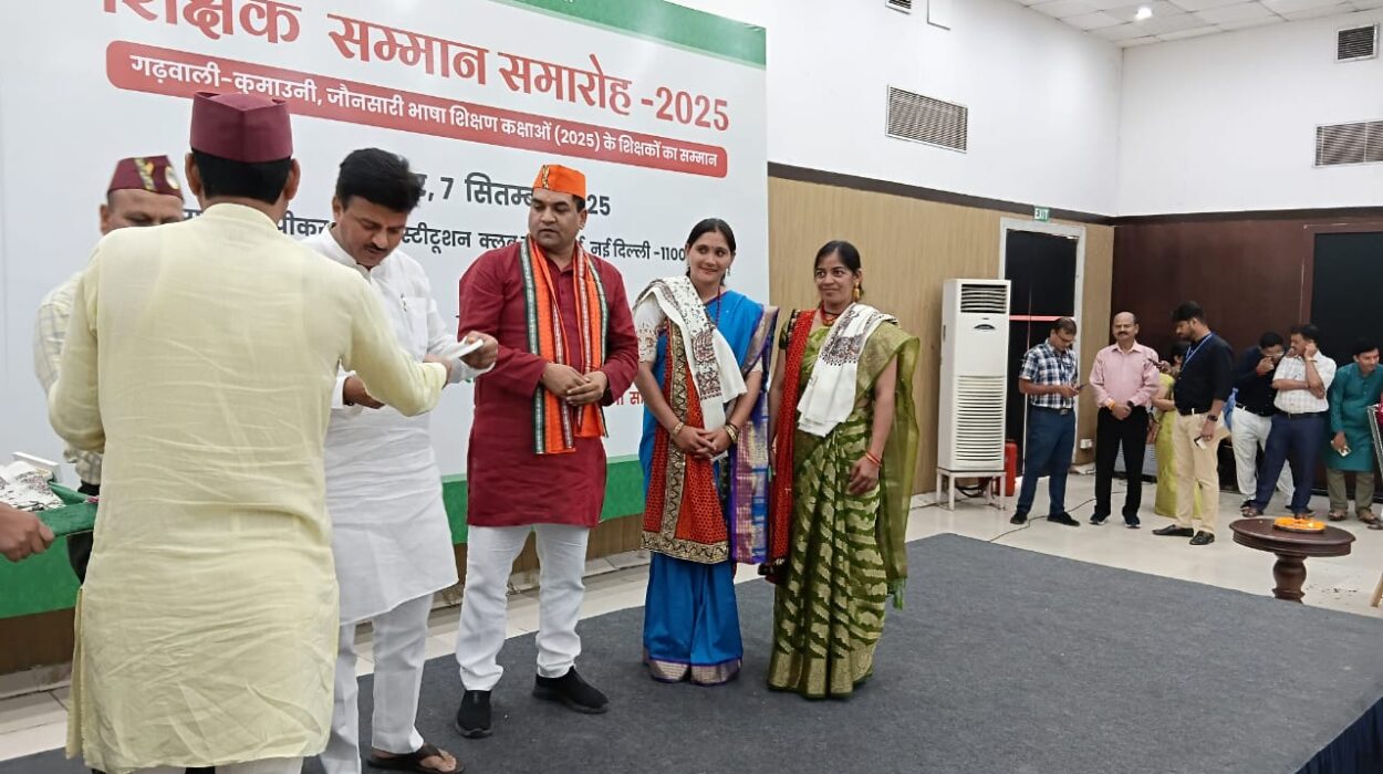 बच्चों के लिए मातृभाषा कुमाउनी, गढ़वाली की ग्रीष्मकालीन कक्षाओं के संचालन में सहयोगी रहे शिक्षकों को स्पीकर हॉल, कांस्टीटयूशन क्लब नई दिल्ली में शिक्षक सम्मान 2025 से सम्मानित किया गया। यह सम्मान समारोह उत्तराखंड लोक – भाषा साहित्य मंच, नई दिल्ली एवं समस्त सहयोगी संस्थाओं के द्वारा किया गया। शिक्षक सम्मान समारोह – 2025 में दिल्ली की मुख्यमंत्री रेखा गुप्ता, साहित्य संस्कृति भाषा मंत्री कपिल मिश्रा व डीपीएमआई के निदेशक व उत्तराखंड लोक- भाषा साहित्य मंच- नई दिल्ली के संरक्षक डॉ. विनोद बछेती की गरिमामयी उपस्थिति में हुआ। उत्तराखंड के कुमाउं मण्डल के चंपावत जिले से तुलसी भट्ट, ललित मोहन तिवारी व हेमा बिष्ट अल्मोड़ा जनपद से कृपाल सिंह शीला, त्रिभुवन जलाल, प्रभा बिष्ट व मोहनचन्द्र गड़ाकोटी जी का मंच पर शॉल ओढ़कर व स्मृति चिन्ह प्रदान कर सम्मानित किया गया। मातृभाषा शिक्षण कक्षाओं में सहयोग दे रहे अन्य शिक्षकों के शॉल व स्मृति चिन्ह उनके केन्द्र से आये शिक्षकों को प्रदान किये गये। उत्तराखंड व दिल्ली के मातृभाषा प्रमियों ने मातृभाषा कक्षा संचालन में सहयोगी रहे सभी शिक्षकों को सम्मानित किये जाने पर प्रसन्नता व्यक्त की गयी।
