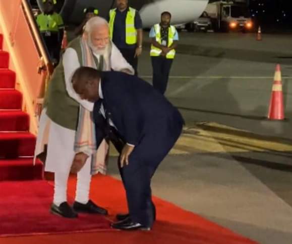 तस्वीरों के अनुसार, जैसे ही पीएम मोदी हवाई अड्डे पर पहुंचे, वहां के पीएम जेम्स मरापे ने उनके पैर छूकर उनका स्वागत किया| साथ ही भारत के पीएम को एयरपोर्ट पर ही गार्ड ऑफ ऑनर भी दिया|