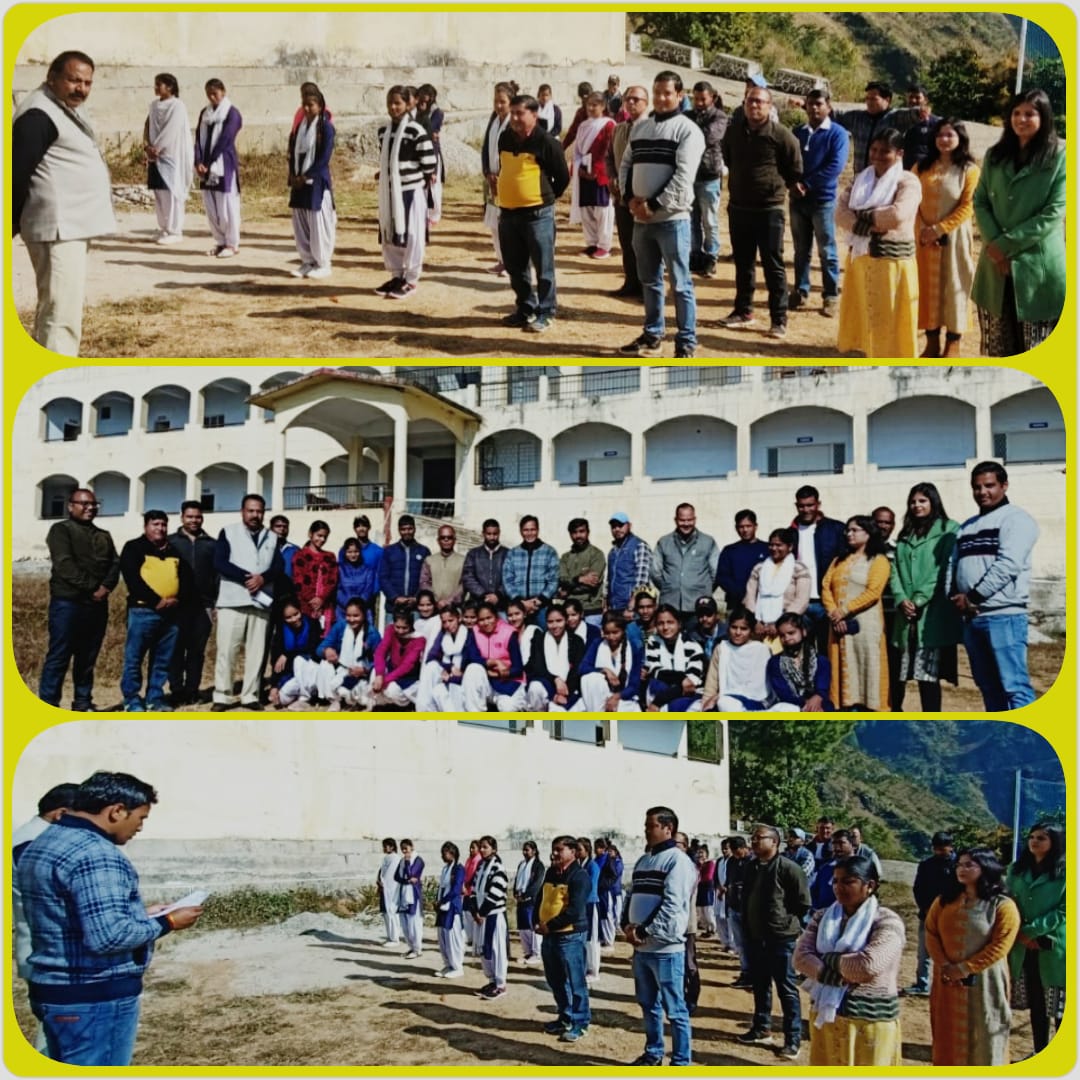 भारत का संविधान सभी को समानता, स्वतंत्रता, न्याय व विचारो की अभिव्यक्ति देता है। इस दौरान राष्ट्रीय सेवा योजना कार्यक्रम अधिकारी एवं कार्यक्रम समारोहक डॉ० आराधना बंधानी ने संविधान दिवस के उद्देश्यों के बारे मे प्रकाश डाला। तत्पश्चात कार्यक्रम सह-समारोहक डॉ० भरत गिरी गोसाई ने भारत का संविधान की उद्देशिका को सबके सामने पढ़कर अवगत कराया। इस दौरान प्राचार्य द्वारा सभी प्राध्यापको, कर्मचारियो एवं छात्र-छात्राओ को संविधान पालन करने हेतु शपथ दिलाई गयी। बी०एस-सी० तृतीय वर्ष की छात्रा कुमारी निशा द्वारा सभी छात्र-छात्राओ को छात्र प्रतिज्ञा भी दिलाई गयी। संविधान दिवस के इस कार्यक्रम मे डॉ० अजय कुमार सिंह, डॉ० विजयराज उनियाल, श्री अमित कुमार सिंह, श्रीमती सीमा, डॉ० बिशनलाल, डॉ० प्रमोद रावत, डॉ० नेपाल सिंह, डॉ० राकेश रतूड़ी, डॉ० बबीता बंटवाण, डॉ० छत्र सिंह कठायत, श्री अनुपम रावत, श्री मुकेश रतूड़ी, श्री कुंदन लाल, श्री अजीत नेगी, श्री रोहित कुमार, श्री सुरेंद्र रावत, श्री मिलन रावत, श्री प्रताप सिंह राणा, श्री राकेश कुमार, श्रीमती लक्ष्मी एवं समस्त छात्र-छात्राएं उपस्थित रहे।