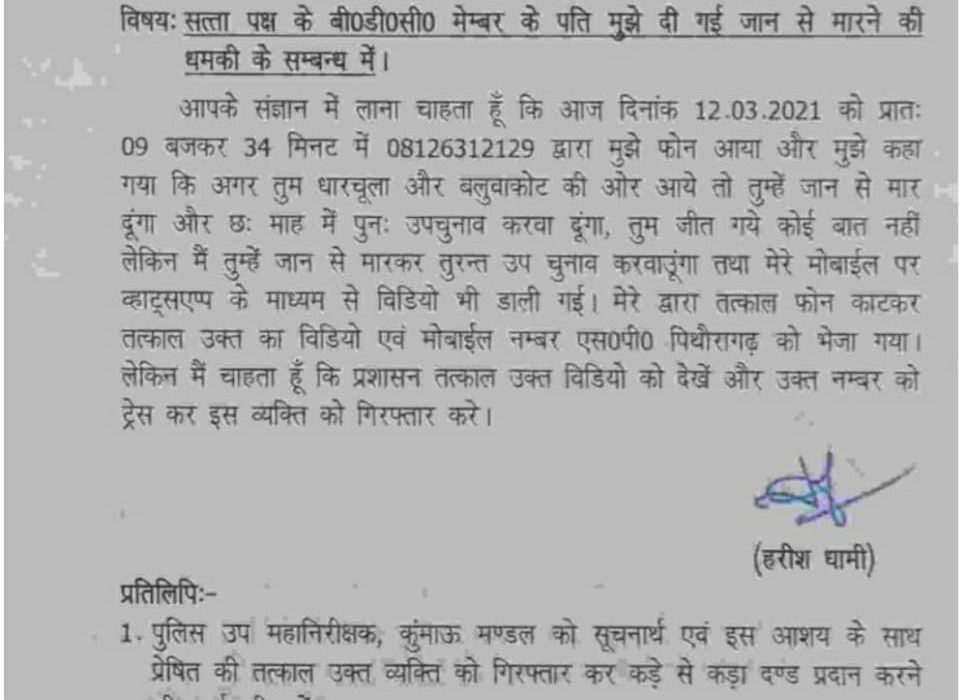 धारचूला विधानसभा के विधायक हरीश धामी को बीते शनिवार 12 मार्च 2022 को प्रातः 9:34 में एक फोन नंबर से फोन आया जिसमें उन्हें कहा गया कि अगर वे धारचूला और बलुवाकोट की ओर गए तो उन्हें जान से मार दिया जाएगा। यह फोन हरीश धामी को 9:34 में 081263 12129 इस मोबाइल नंबर से आया था। जिसमे उन्हें कहा गया कि अगर वे धारचूला या फिर बलुवाकोट की तरफ गए तो उन्हें मार दिया जाएगा और 6 महीने में ही उपचुनाव करवा दिया जाएगा। यह फोन विधायक को किसी अज्ञात नंबर से अज्ञात व्यक्ति ने किया जिसके बाद उनके मोबाइल में एक वीडियो भी भेजी गई। तथा हरीश धामी ने वह मोबाइल नंबर और वीडियो एसपी पिथौरागढ़ को भेजा। और कहा की प्रशासन द्वारा तत्काल इस नंबर को ट्रेस किया जाए। और उक्त व्यक्ति को गिरफ्तार कर लिया जाए।