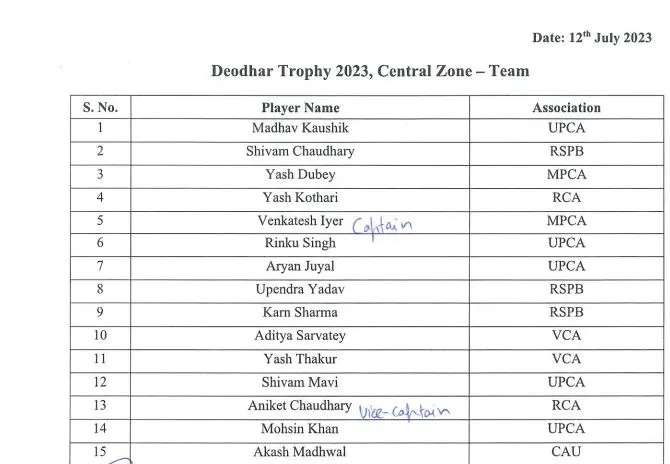 हल्द्वानी| देवधर ट्रॉफी के लिए यूपीसीए ने सेंट्रल जोन टीम का ऐलान कर दिया है। 15 सदस्यीय टीम में उत्तराखंड के आकाश मधवाल और आर्यन जुयाल का चयन हुआ है। सेंट्रल जोन टीम की कमान वेंकटेश अय्यर को दी गई है तो वहीं अनिकेत चौधरी को टीम का उप कप्तान घोषित किया गया है।