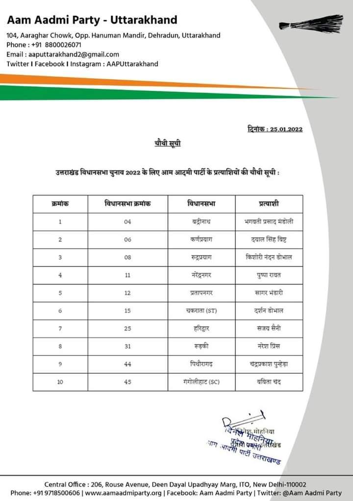 देहरादून| विधानसभा चुनाव में अब कुछ ही वक्त बचा हुआ है सभी पार्टियां अपने-अपने उम्मीदवारों का नाम जारी कर रही है| इसी क्रम में आम आदमी पार्टी ने आगामी विधानसभा चुनाव के लिए प्रत्याशियों की चौथी सूची भी जारी कर दी है| इसमें 10 प्रत्याशियों के नामों की घोषणा की है|