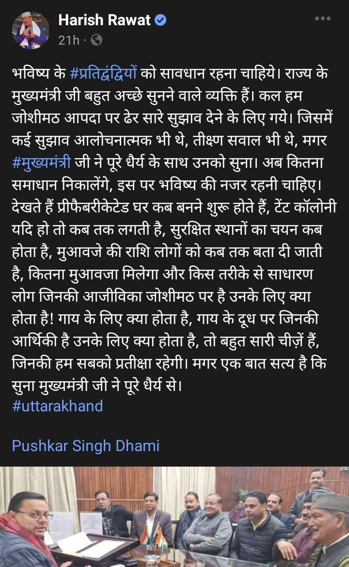 अपनी पोस्ट में हरीश रावत ने लिखा, ‘भविष्य के प्रतिद्वंद्वियों को सावधान रहना चाहिए| राज्य के मुख्यमंत्री जी बहुत अच्छे सुनने वाले व्यक्ति हैं| कल हम जोशीमठ आपदा पर ढेर सारे सुझाव देने के लिए गए| जिसमें कई सुझाव आलोचनात्मक भी थे, तीक्ष्ण सवाल भी थे, मगर मुख्यमंत्री जी ने पूरे धैर्य के साथ उनको सुना| अब कितना समाधान निकलेगा इस पर भविष्य की नजर रहनी चाहिए| देखते हैं प्री-फेब्रिकेडेट घर कब बनने शुरू होते हैं, टेंट कॉलोनी यदि हो तो कब तक लगती है, सुरक्षित स्थानों का चयन कब होता है, मुआवजे की राशि लोगों को कब तक बांटी जाती है, कितना मुआवजा मिलेगा और साधारण लोग जिनकी आजीविका जोशीमठ पर है उनके लिए क्या होता है, गाय के लिए क्या होता है, गाय के दूध पर जिनकी आर्थिकी है उनके लिए क्या होता है, तो बहुत सारी चीजें हैं, जिनकी हम सबको प्रतीक्षा रहेगी| मगर एक बात सत्य है कि सुना मुख्यमंत्री जी ने पूरे धैर्य से|’