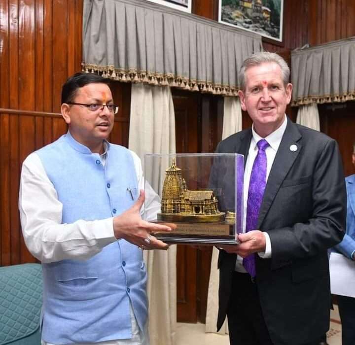 देहरादून। उत्तराखंड राज्य के मुख्यमंत्री पुष्कर सिंह धामी से बीते 29 अगस्त 2022 को सोमवार के दिन मुख्यमंत्री कैंप कार्यालय में ऑस्ट्रेलिया के उच्चायुक्त बैरी ओ फैरेल ने मुलाकात की इस मुलाकात के दौरान इन दोनों के बीच कई मुद्दों पर चर्चा भी की गई। इस दौरान उत्तराखंड के बारे में बताते हुए मुख्यमंत्री पुष्कर सिंह धामी ने कहा कि उत्तराखंड एक जैव विविधता संपन्न और हिमालयी राज्य हैं तथा यहां पर एग्रीकल्चर, हॉर्टिकल्चर ,एडवेंचर, स्पोर्ट्स एवं पर्यटन के क्षेत्र में कई संभावनाएं हैं इसके अलावा भी राज्य में साइंस एवं टेक्नोलॉजी फार्मा ,ग्रीन एवं रिन्यूअल एनर्जी के क्षेत्र में भी काफी संभावनाएं नजर आती हैं। मुख्यमंत्री पुष्कर सिंह धामी ने कहा कि उत्तराखंड राज्य में कमांड एवं ट्रैफिक कंट्रोल सिस्टम को मजबूत किया जाए साथ में उन्होंने यह भी बताया कि उत्तराखंड में औद्योगिक विकास हेतु कार्य काफी तेजी से हो रहे हैं। बातचीत के दौरान ऑस्ट्रेलिया के उच्चायुक्त ने उत्तराखंड के साथ सहयोग करने के इच्छा व्यक्त की। उन्होंने कहा कि ऑस्ट्रेलिया में अनेक छात्र छात्राएं भारत से पढ़ने के लिए आते हैं और कुछ सालों से तो और भी अधिक संख्या में वहां पर विद्यार्थी पढ़ने के लिए आ रहे हैं। मुलाकात के दौरान मुख्यमंत्री पुष्कर सिंह धामी ने ऑस्ट्रेलिया के उच्चायुक्त को प्रतीक चिन्ह भी भेंट किया।