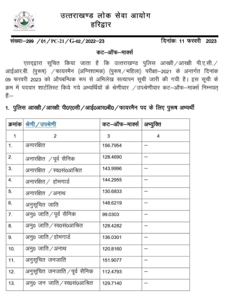 उत्तराखंड लोक सेवा आयोग ने पुलिस आरक्षी भर्ती परीक्षा की कट ऑफ मेरिट लिस्ट जारी कर दी है|