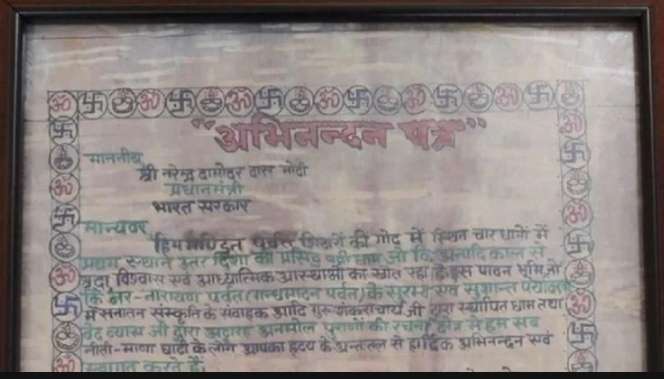 हरी, लाल और काली स्याही से इस अभिनंदन पत्र को लिखा गया है| अभिनंदन पत्र में पीएम मोदी का बद्रीनाथ और माणा में पदार्पण पर हार्दिक आभार प्रकट किया गया है|
