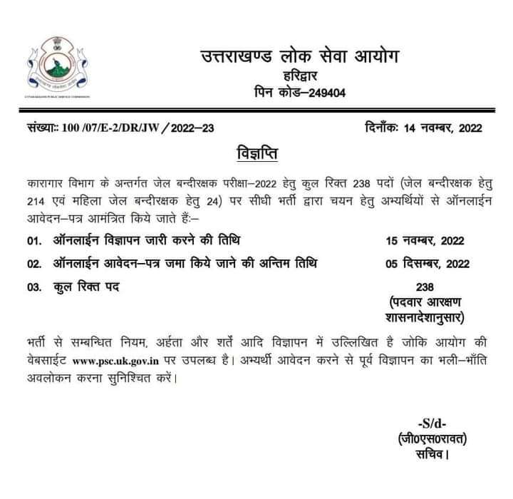 उत्तराखंड लोक सेवा आयोग ने कारागार विभाग में बंदी रक्षक के 238 पदों पर भर्ती का विज्ञापन जारी किया है| इसके लिए 15 नवंबर से 5 दिसंबर तक ऑनलाइन आवेदन कर सकते हैं|
