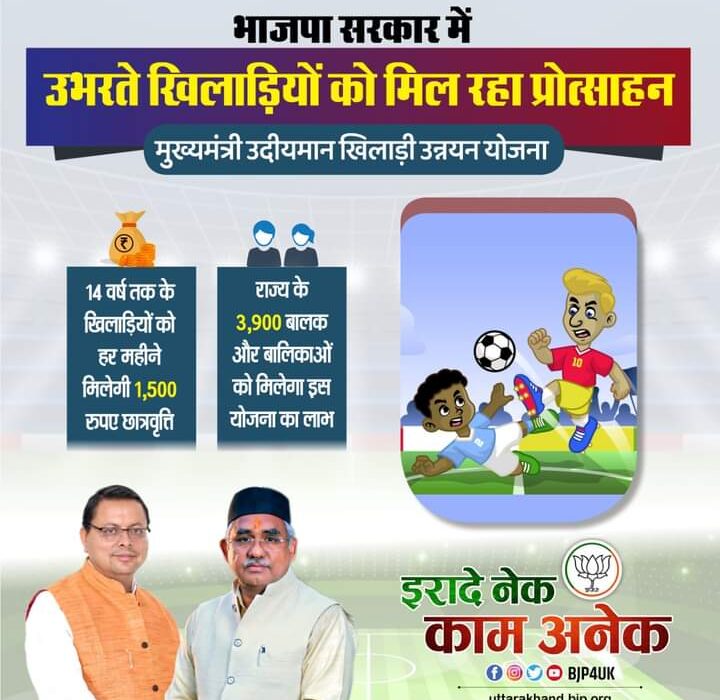 बताते चलें कि मुख्यमंत्री धामी के अनुमोदन के बाद विशेष प्रमुख सचिव खेल अभिनव कुमार ने यह आदेश दिया| सीएम धामी ने खेलों को बढ़ावा देने और बच्चों की शारीरिक क्षमता बढ़ाने के लिए मुख्यमंत्री उदयीमान खिलाड़ी उन्नयन योजना शुरू करने का ऐलान किया है| इसके तहत प्रत्येक जिले में से 150-150 बालक-बालिकाओं को प्रतिमाह 1500 रुपये छात्रवृत्ति दी जाएगी| यह छात्रवृत्ति एक वर्ष के लिए ही होगी| अगले वर्ष इस उम्र के बच्चों को दोबारा स्क्रीनिंग टेस्ट के बाद मेरिट के आधार पर ही चयन किया जाएगा| 8 से 14 वर्ष के हर आयु वर्ग के 25 खिलाड़ियों का चयन छात्रवृत्ति के लिए किया जाएगा| छात्र-छात्राओं का चयन उनकी शारीरिक क्षमता जैसे स्पीड, स्टेमिना स्ट्रैंथ का आकलन भारत सरकार के मान्यता प्राप्त मानकों के आधार पर किया जाएगा| प्रत्येक स्कूल के चयनित छात्र-छात्राओं का न्याय पंचायत स्तर पर परीक्षण होगा| इसके बाद ब्लॉक और फिर अंतिम चयन जिला स्तर पर किया जाएगा| जिले की मेरिट के आधार पर छात्र-छात्राओं को छात्रवृत्ति दी जाएगी| विशेष प्रमुख सचिव अभिनव कुमार ने कहा कि इस तरह की छात्रवृत्ति के कई सुखद परिणाम नजर आएंगे|