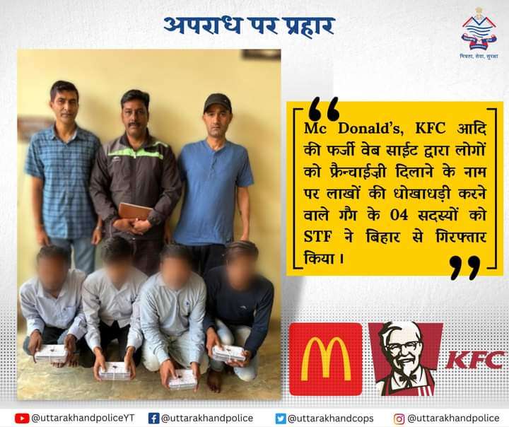 देहरादून| आमजनता से साईबर ठगी करने वालों के विरूद्ध उत्तराखंड पुलिस द्वारा सख्त कार्यवाही करते हुए विभिन्न प्रतिष्ठित कम्पनियों KFC McDonald’s की फर्जी वेबसाईट बनाकर लोगों को फ्रैन्चाईज़ी दिलाने के नाम से लाखों की धोखाधड़ी करने वाले गैंग के 04 सदस्यों सनी कुमार वर्मा, सूरज कुमार वर्मा, सनी कुमार व चन्दन कुमार उर्फ विकास को एसटीएफ द्वारा बिहार से गिरफ्तार करने में सफलता प्राप्त की गयी ।