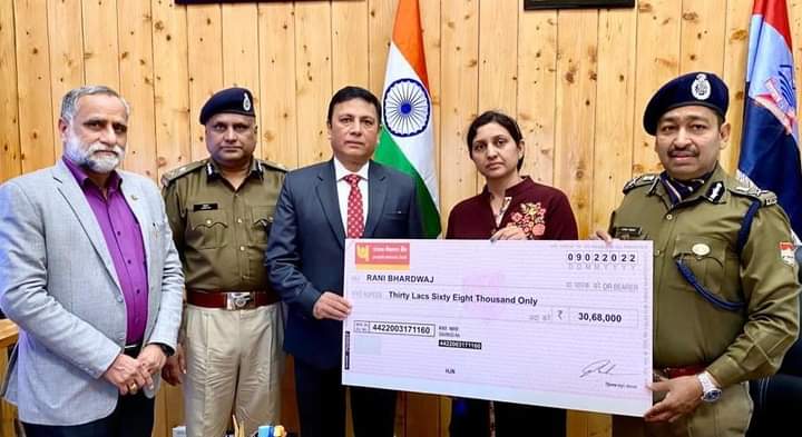 देहरादून| जोनल मैनेजर पंजाब नेशनल बैंक देहरादून जोन द्वारा रक्षक प्लस योजना के अंतर्गत सड़क दुर्घटना में जान गंवाने वाले जनपद रुद्रप्रयाग में तैनात उपनिरीक्षक पवन कुमार की पत्नी श्रीमती रानी भारद्वाज को पंजाब नेशनल बैंक की ओर से 30 लाख रुपये का चेक दिया गया|